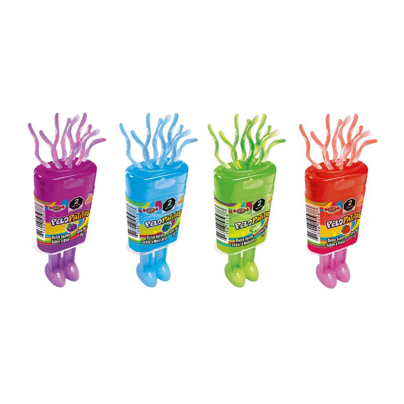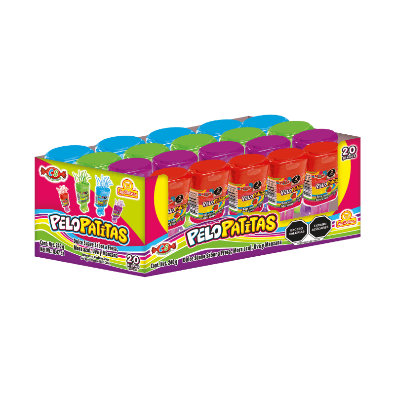 Pelo Patitas es un dulce suave y colorido que destaca por su forma divertida y su textura irresistible. Cada unidad viene en un envase práctico con “pelitos” que hacen que el producto se convierta en una experiencia visual y deliciosa. Es un snack que atrae por su originalidad y se disfruta en cualquier momento, ya que combina diseño creativo y sabores vibrantes.