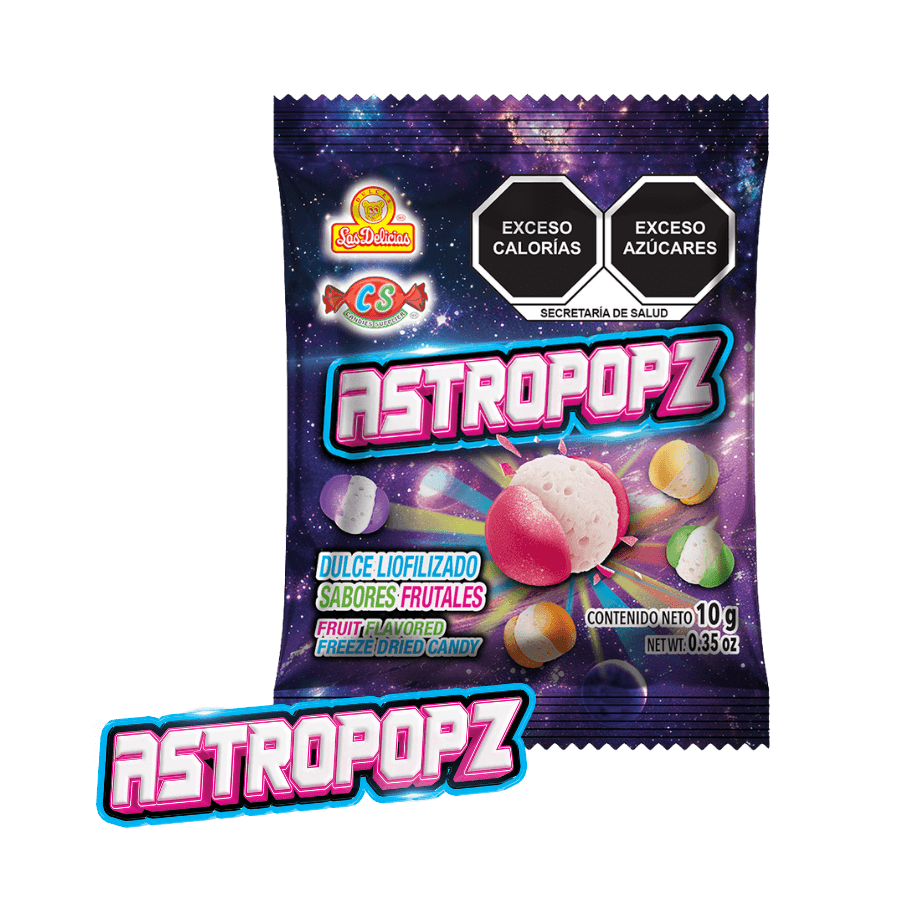 Gracias a su proceso de liofilización, Astropopz presenta una textura ligera, aireada y ligeramente crujiente que se deshace en la boca. Además, sus sabores frutales aportan una experiencia intensa y diferente a las golosinas tradicionales, generando curiosidad y repetición de compra.