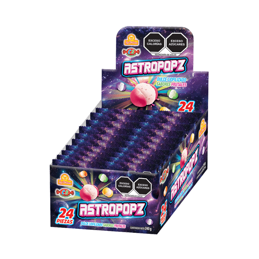 Astropopz de Candies Supplier es una golosina innovadora que lleva la experiencia dulce a otro nivel. Inspirado en el universo y con un diseño visual impactante, este producto combina tecnología de liofilización con sabores frutales para ofrecer una propuesta única en el mercado.
