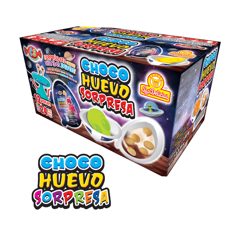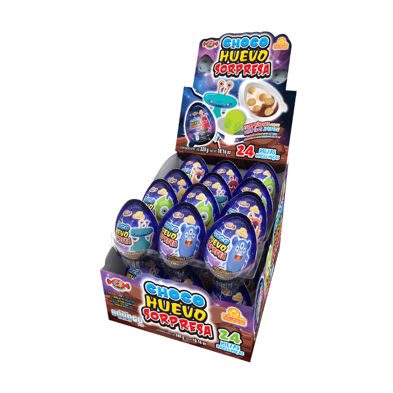 Cada caja incluye 12 displays, con un total de 24 huevos sorpresa por caja. Su diseño llamativo y sus colores brillantes lo convierten en un producto perfecto para destacar en góndolas o exhibidores.