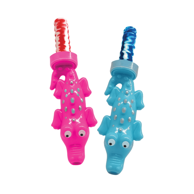 Unidad individual: Cada pieza tiene un envase plástico con forma de cocodrilo en colores vibrantes como rosa o azul. El caramelo macizo se encuentra en la parte superior, presentado en un formato espiral que aporta dinamismo y hace que el producto se vea aún más atractivo.