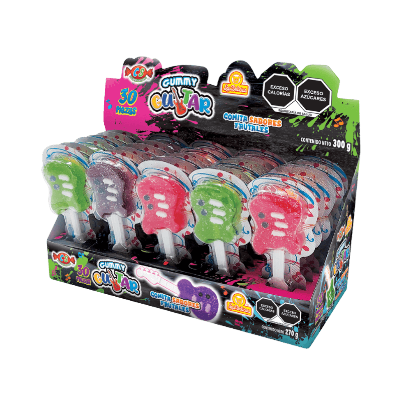 Display: Incluye 30 gomitas con forma de guitarra, presentadas verticalmente. El display es colorido, tiene detalles musicales y muestra las piezas completas, lo que ayuda a captar la atención.