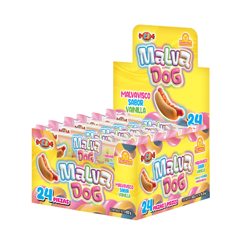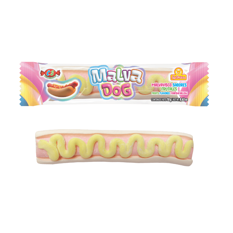 Malva Dog es un malvavisco divertido y llamativo que imita la forma de un hot dog, combinando colores suaves con una textura esponjosa y ligera. Es un dulce que atrae rápidamente por su diseño creativo y su presentación individual, lo que lo convierte en una opción ideal para niños y para consumidores que buscan algo distinto dentro de la categoría de malvaviscos.