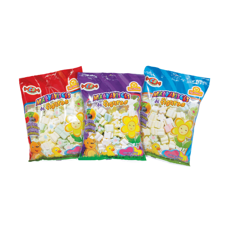 Bolsas individuales (150 g): Disponibles en colores como rojo, morado y azul. Cada bolsa muestra claramente las figuras del malvavisco, su variedad de colores y la estética infantil que caracteriza al producto.
