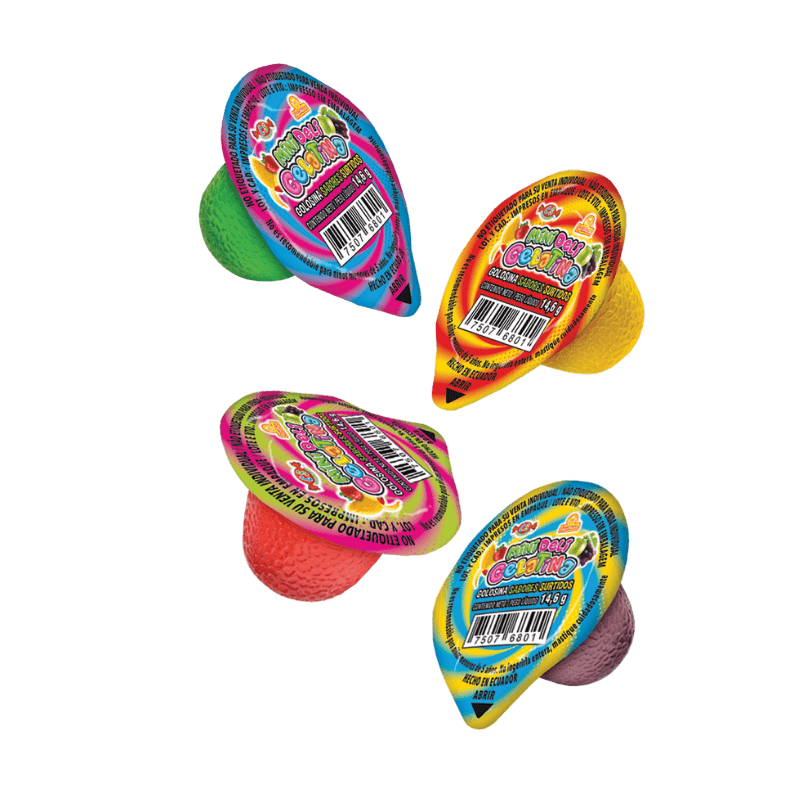 Cada unidad contiene sabores clásicos como fresa, mango, manzana y uva. Estas gelatinas están elaboradas con base de algas marinas, ofreciendo una opción diferente y original dentro del mundo de las golosinas.